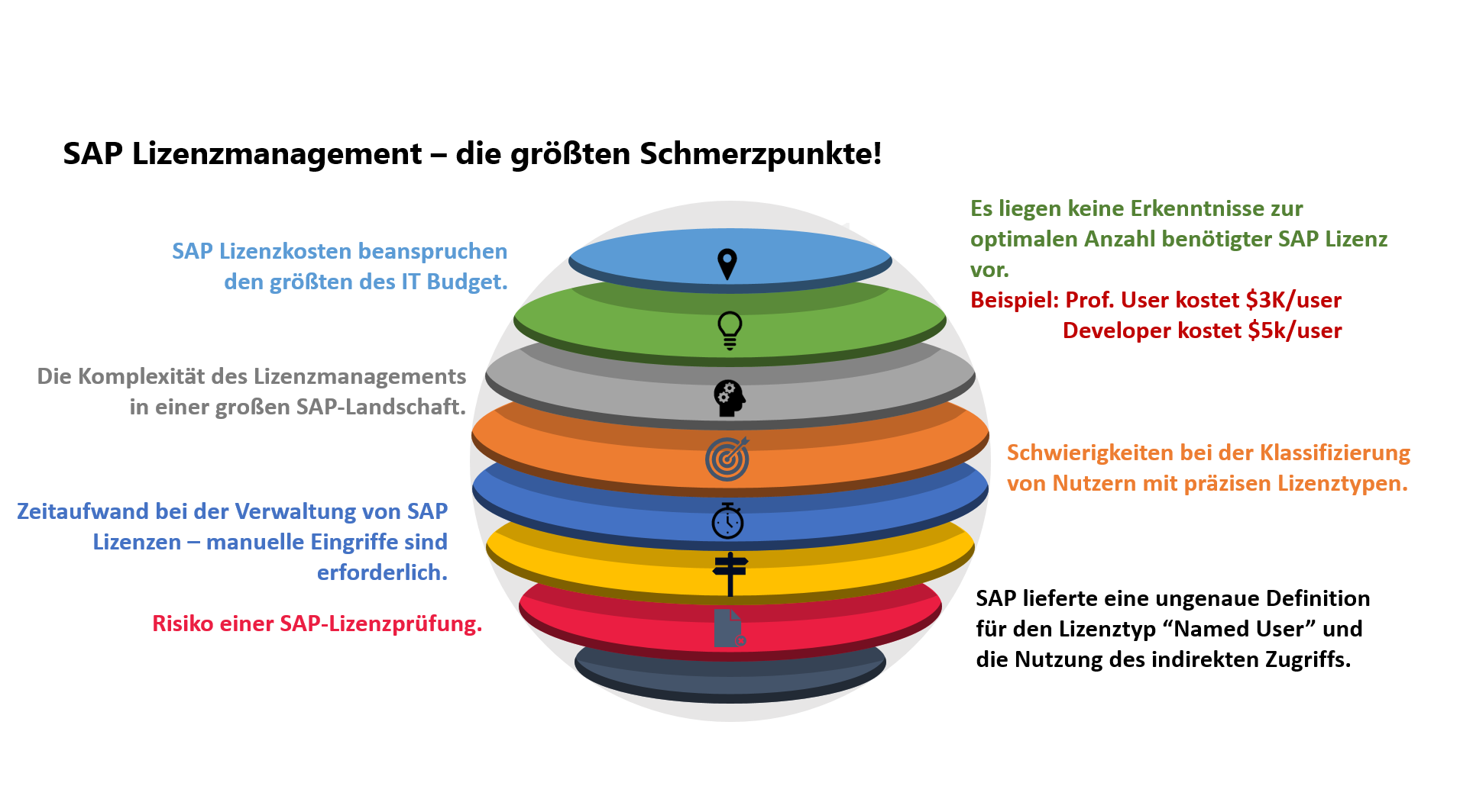 Die Komplexität der SAP-Lizenzmodelle ist vielfach eine ständige Herausforderung. Jährlich werden hohe Beträge an Wartungsgebühren für Lizenzen fällig, die ungenutzt bleiben (sogenannte Shelfware)oder aufgrund überdimensionierten Lizenztypen entstehen.